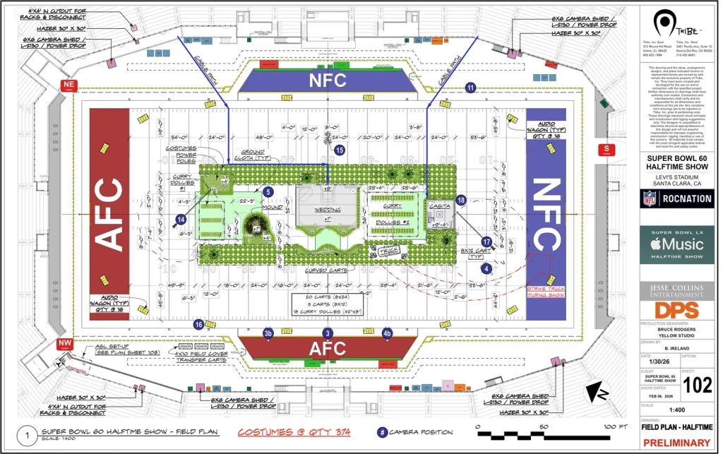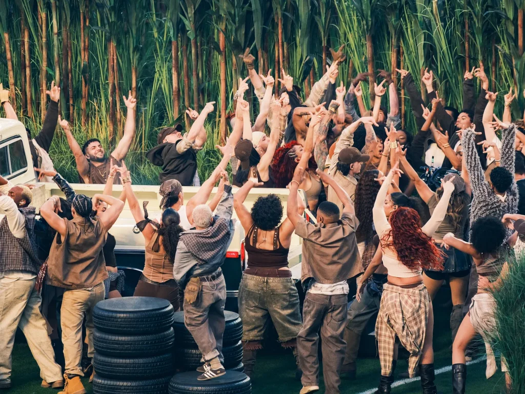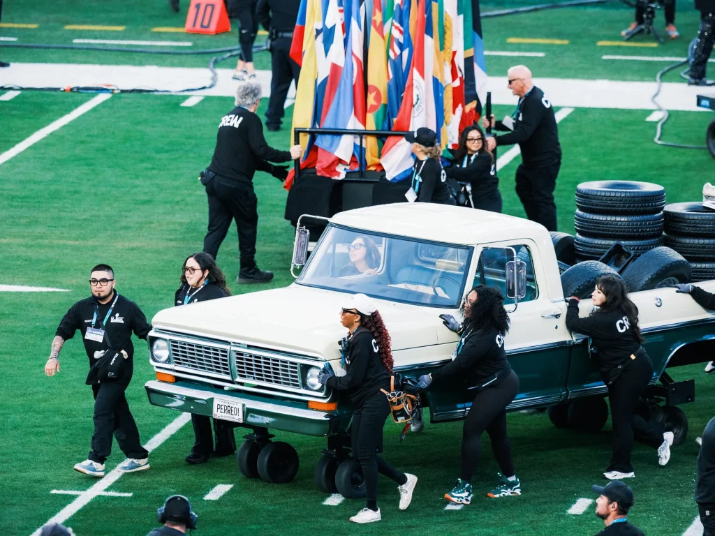 Benito Antonio Martínez Ocasio—better known as Bad Bunny—wanted his halftime show to capture the spirit of his Puerto Rican residency. The field came alive with casitas, a vintage truck, sugarcane stalks, and a living, breathing palm landscape. Over 380 performers donned costumes to become part of the scenery, moving the living stage across the field on specially designed “turf tires”.