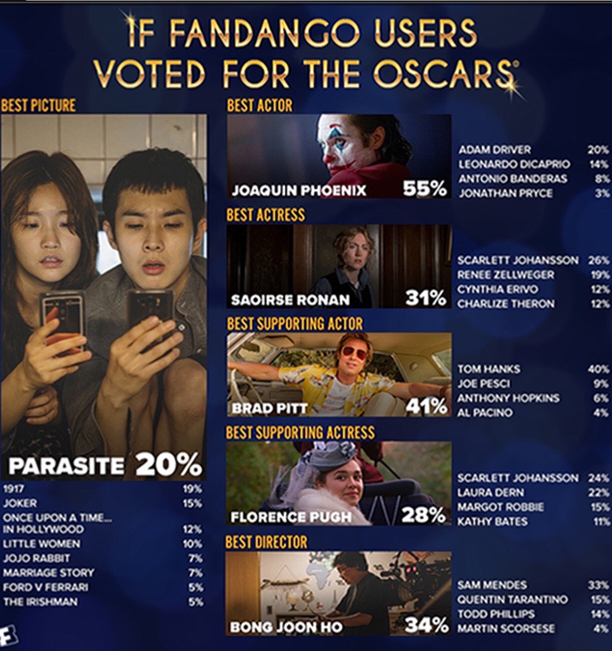 If the Oscars award ceremony was put into your hands, who would walk the stage? Fandango Media – an American ticket selling company, held a poll on their website that gave users the choice for voting the major categories of the Oscars. Results show Bong Joon-ho’s Parasite for Best Picture and Bong Joon-ho as Best Director.