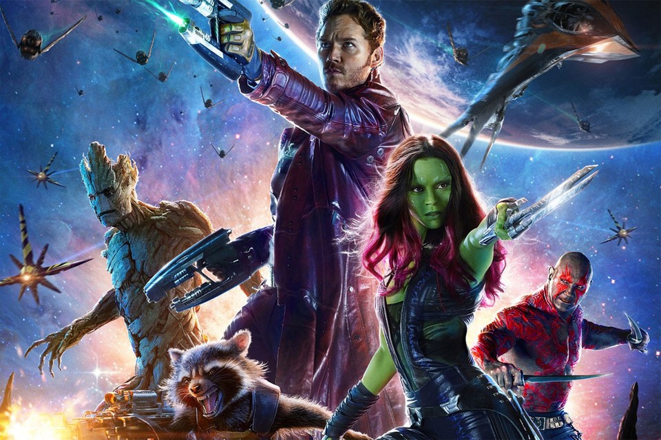 The poster shows the main cast of Guardians of The Galaxy, which includes Chris Pratt (Peter Quill), Dave Bautista (Drax), Zoe Saldaña (Gamora), and Karen Gillan (Nebula). Other cast members include Will Poulter, Chukwudi Iwuji, and Maria Bakalova.