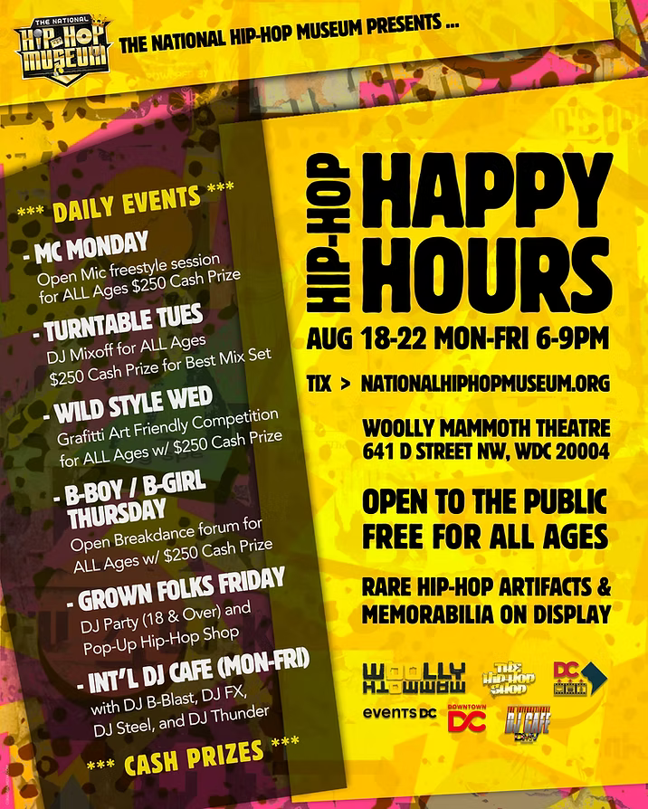 For the first time in its history, the National Hip-Hop Museum is expanding the induction into a dynamic week of immersive events, honoring the culture’s roots, icons, and future. From August 18th to August 22nd, the Museum, in partnership with the Downtown D.C. Business Improvement District and Woolly Mammoth Theatre, will host “Hip-Hop Happy Hours”—a vibrant series of free, all-ages experiences packed with art battles, breakdance forums, live DJ sets, historical exhibits, and daily cash prizes.