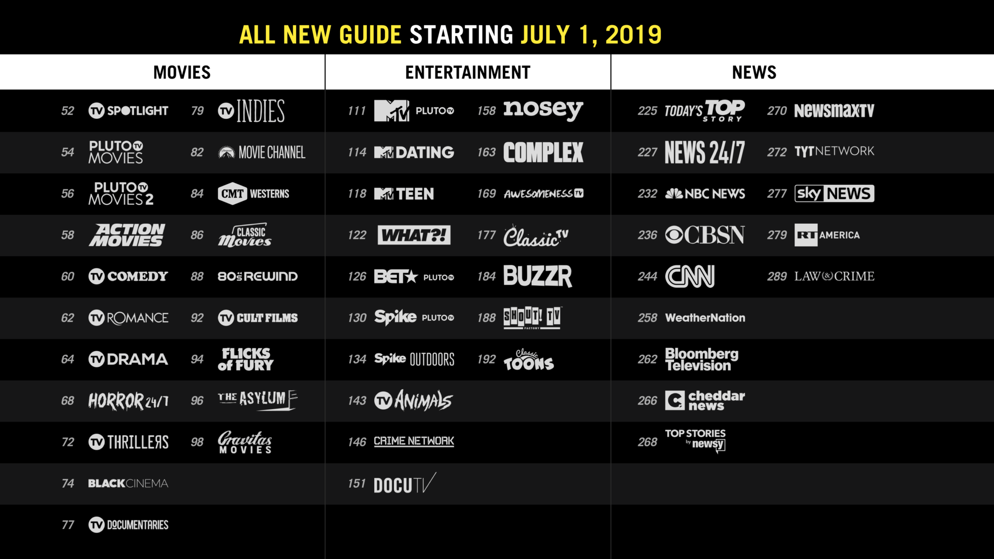 Pluto Tv is still free and still very reliable! Only changing for the better! Pluto Tv has confirmed with Cordcuttersnews Monday, July 1, 2019 is the official date we’ll see the significant changes and experience efficient content streaming. Below is the new and improved channel line up and new Pluto Tv channel numbers.