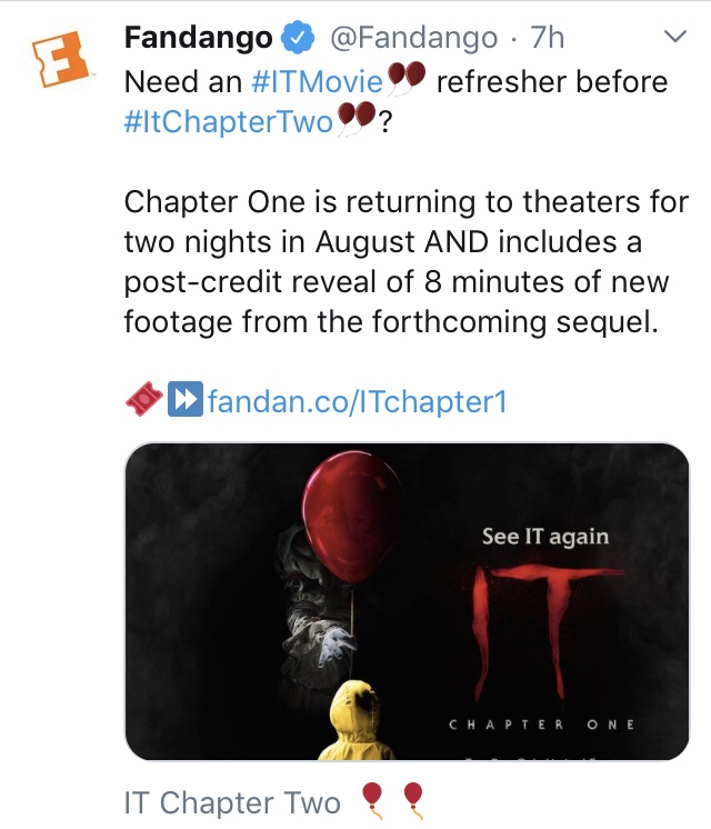 Fandago has taken to social media platforms such as Twitter and Instagram to announce and advertise a special screening refresher. The first chapter of IT will be screening in theaters for two nights in August, with a special post-credit reveal of eight minutes of new footage from the forthcoming sequel! This surprise is brought to us by the partnership between Fandango and Warner Brothers. Tickets are on sale now!