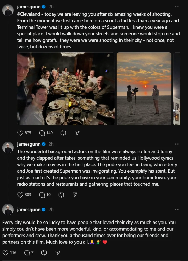 James Gunn has given an update about the upcoming Superman movie. After news sources caught the filming process at Cleveland Public Square in June, the director confirmed on X that scenes were recorded there, adding that the Superman film crew was in the area for six weeks. He also applauded the background actors who helped him regain his passion.