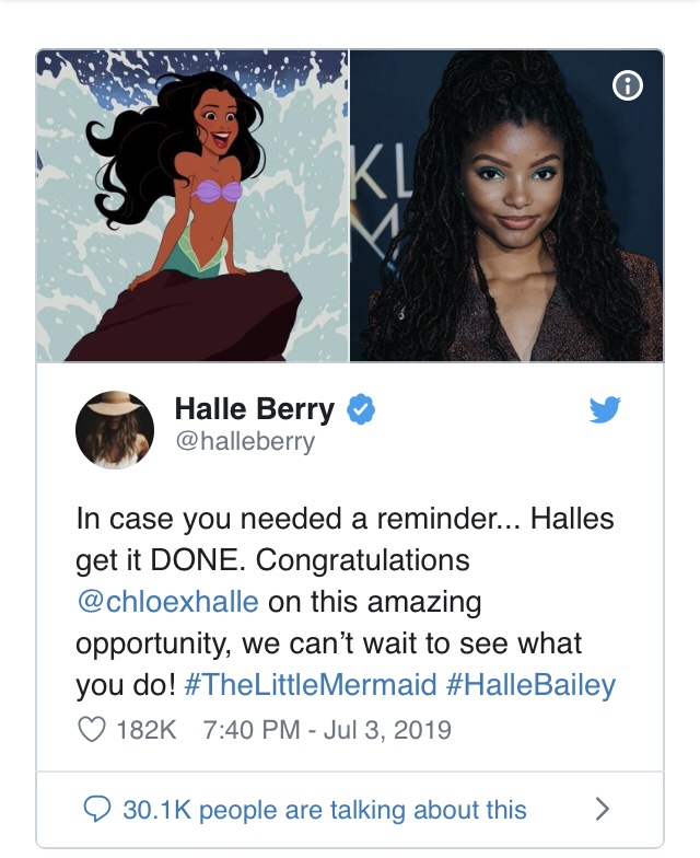 If you had to read her name twice, you and I are one in the same creature. But we’re not completely lost at sea: The double take isn’t a rare call. Halle Berry actually reached out to 19 year old actress and singer, Halle Bailey to congratulate her on her casting as Ariel tweeting, “In case you needed a reminder…. Halles get it DONE!” Facts!